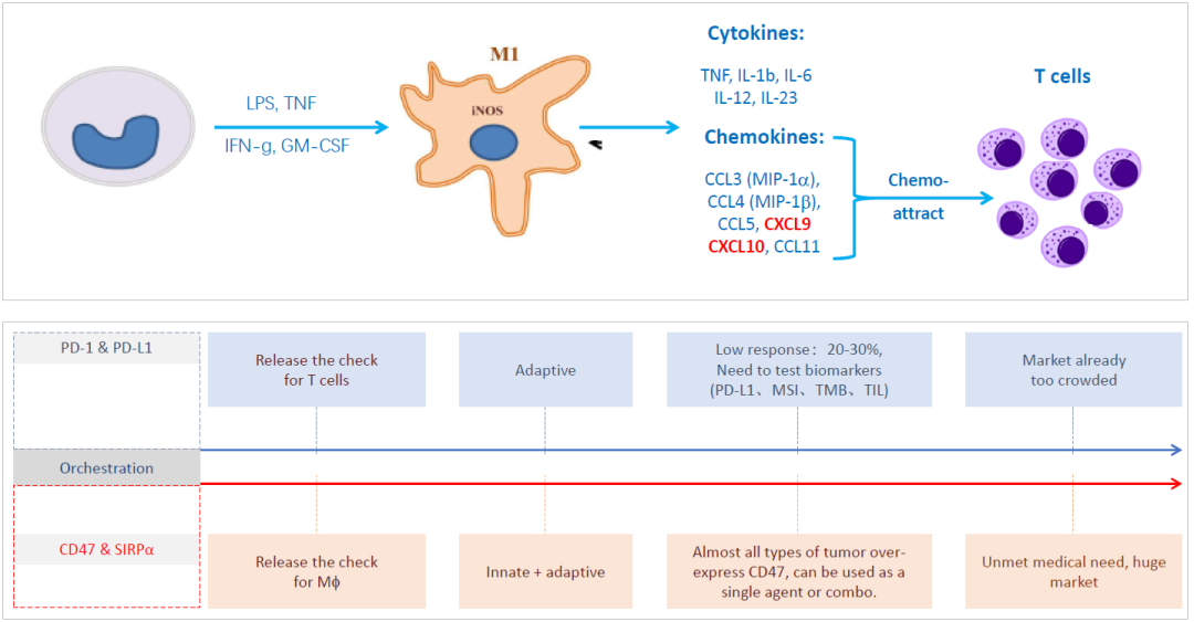 PD-1抗體也已證明對多種腫瘤具有優(yōu)越療效,然而受限于腫瘤組織中T細胞的含量(比如“冷腫瘤”),大多數(shù)患者對PD-1抗體的治療沒有良好效果。巨噬細胞是一種先天免疫細胞,同時也是職業(yè)性抗原遞呈細胞,激活以后可以通過以下途徑改善PD-1抗體的療效及維持療效的持久性: